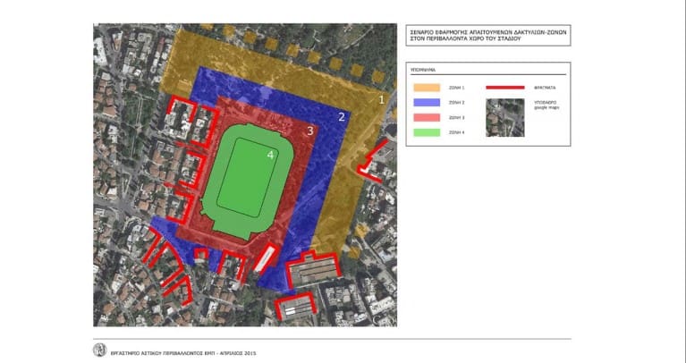 Εικόνα 13. Σενάριο εφαρμογής απαιτούμενων δακτυλίων–ζωνών στον περιβάλλοντα χώρο του Σταδίου. Διακρίνεται η σχετικά άνετη ανάπτυξη τους στα βόρεια και στα ανατολικά (εντός του Άλσους Νέας Φιλαδέλφειας) όπως και η αδυναμία ανάπτυξης τους στα νότια και στα δυτικά λόγω της μεγάλης εγγύτητας των οικοδομικών τετραγώνων και άλλων στοιχείων του αστικού χώρου. Πηγή: Εργαστήριο Αστικού Περιβάλλοντος ΕΜΠ, 2015.