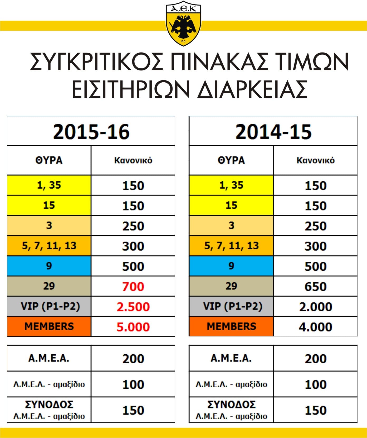 Οι τιμές ανέβηκαν ουσιαστικά μόνο στη θύρα 29 κατά 50ΕΥΡΩ , στις VIP κάρτες διαρκείας κατά 500ΕΥΡΩ και στις κάρτες για τα μέλη κατά 1000 ΕΥΡΩ.