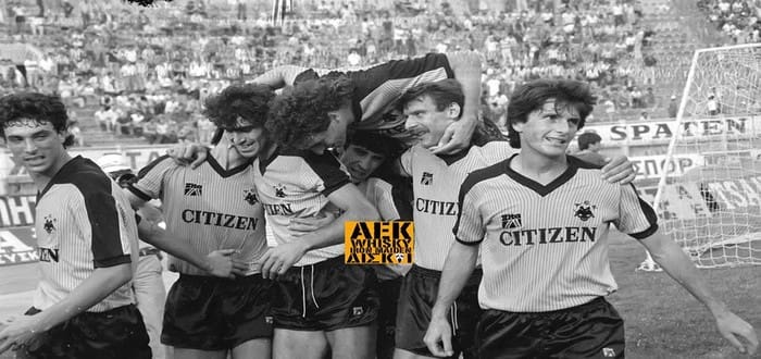 5 Ιουνίου 1983… ΑΕΚ – Ηρακλης 2-0. Οι παίκτες της ΑΕΚ πανηγυρίζουν την επίτευξη τέρματος της ομάδας… Διακρίνονται από αριστερά: Ο Γιάννης Δίντσικος, ο αείμνηστος Γιώργος Χατζηωαννίδης, ο Θωμάς Μαύρος, από πάνω ο Ντίνος Μπαλλής, ο Σταύρος Λέτσας και δεξιά ποιος; Απαντήστε στο κουίζ στο aeklivegr@gmail.com.