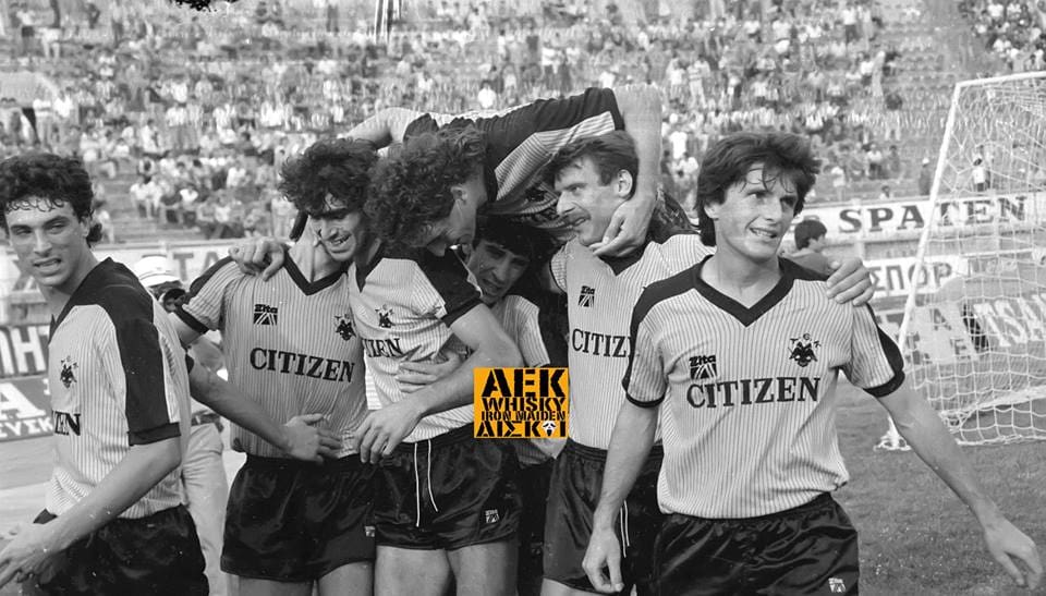 5 Ιουνίου 1983… ΑΕΚ – Ηρακλης 2-0. Οι παίκτες της ΑΕΚ πανηγυρίζουν την επίτευξη τέρματος της ομάδας… Διακρίνονται από αριστερά: Ο Γιάννης Δίντσικος, ο αείμνηστος Γιώργος Χατζηωαννίδης, ο Θωμάς Μαύρος, από πάνω ο Ντίνος Μπαλλής, ο Σταύρος Λέτσας και δεξιά ποιος; Απαντήστε στο κουίζ στο aeklivegr@gmail.com.