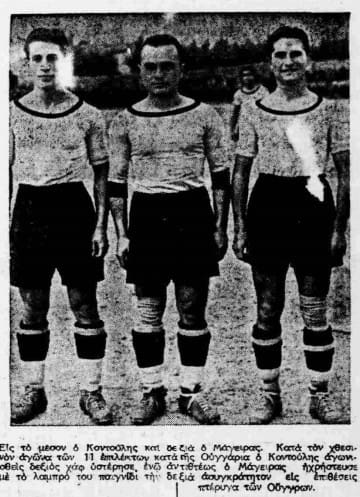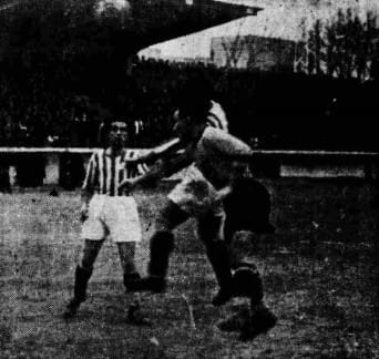 Ο Σπύρος Κοντούλης εν δράσει… Είναι από αγώνα πρωταθλήματος του 1940, πριν την έναρξη του πολέμου. Ο παίκτης της ΑΕΚ απομακρύνει με κεφαλιά την μπάλα μπροστά από τον Μπαλτάση…