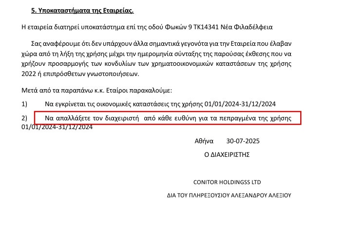 Στο τελευταίο πρακτικό της Γενικής Συνέλευσης της εταιρίας ζητείται από τους μετόχους (υπάρχουν συνολικά στην εταιρία 50 μετοχές) να απαλλάξουν τον διαχειριστή (σ.σ. Αλέξης Αλεξίου) από κάθε ευθύνη και να εγκριθούν οι ισολογισμοί των τελευταίων ετών…