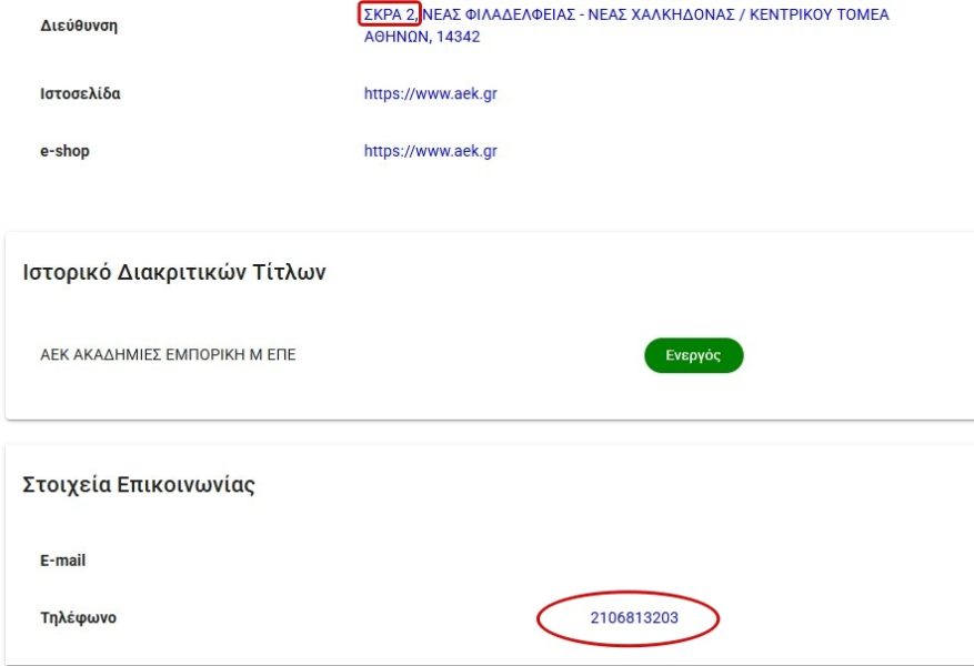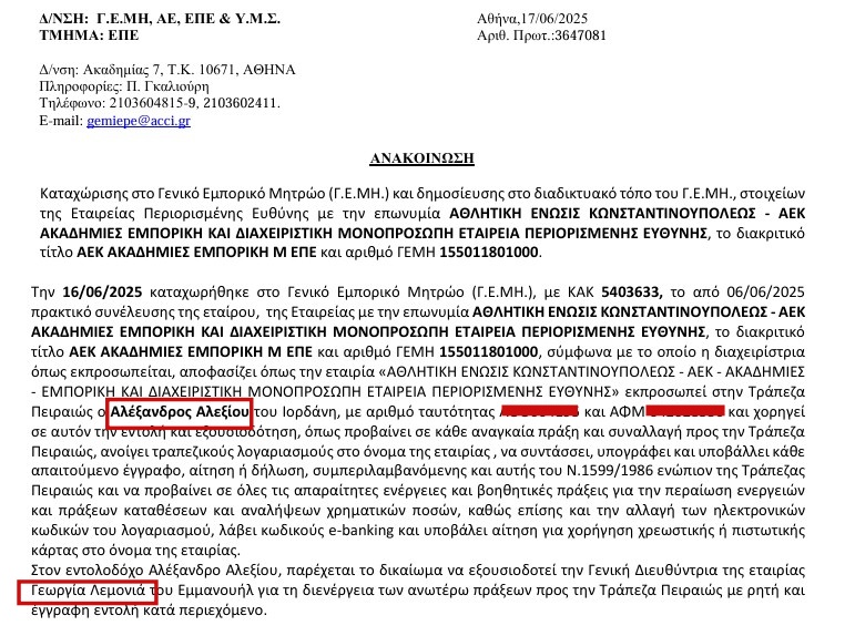 Έδρα της εταιρίας που έχει συσταθεί… ΔΕΝ είναι τα γραφεία της ΑΕΚ, αλλά μια άλλη διεύθυνση στη Νέα Φιλαδέλφεια προς την περιοχή της Αγίας Μαρίνας, (κοντά στα φανάρια του Βλάχου στη Μεταμόρφωση, για όσους γνωρίζουν). Επίσης το τηλέφωνο της εταιρίας δεν είναι το επίσημο τηλέφωνο της ΑΕΚ, αυτό που αντιστοιχεί δηλαδή στα γραφεία του συλλόγου στην Οδό Φωκών, δίπλα στο γήπεδο μας. Είναι άλλο…