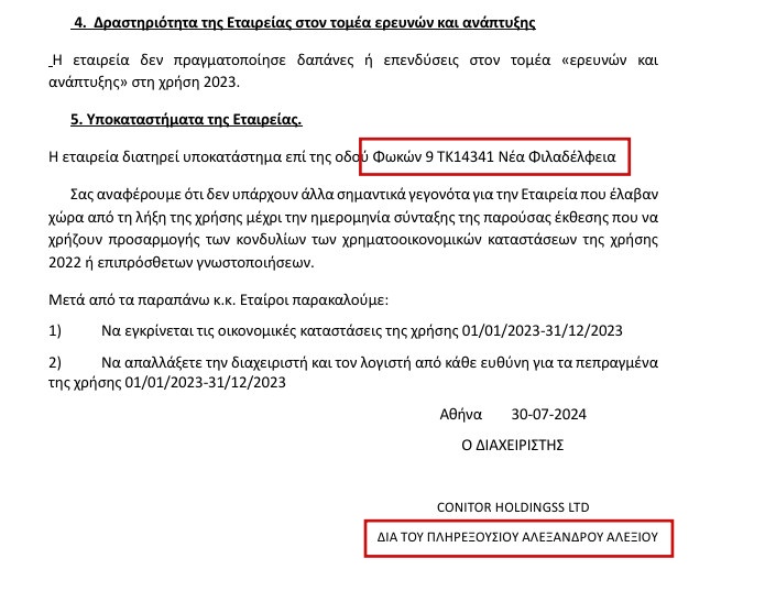 Και τώρα το πιο δυνατό… Πληρεξούσιος για την διαχείριση της εταιρίας που είναι στην Κύπρο και εμπορεύεται το σήμα και τα προϊόντα της ΑΕΚ, είναι ο πρόεδρος της Ερασιτεχνικής Αλέξης Αλεξίου. Η εταιρία την οποία διαχειρίζεται η Κυπριακή Conitor Holdings Ltd, δηλώνει επίσημα ότι διατηρεί υποκατάστημα και στην Ελλάδα… Και πιο είναι αυτό; Τα γραφεία της ΑΕΚ!!! Ασύλληπτο. Η ΑΕΚ είναι υποκατάστημα κάποιας κυπριακής εταιρίας με βάση τη Λευκωσία… Όσες φορές και να το δούμε δεν το πιστεύουμε