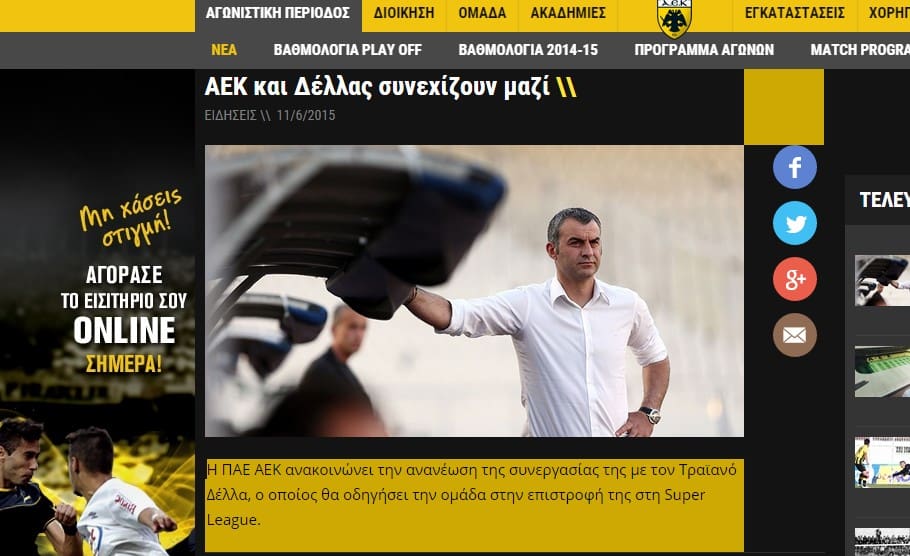 Μετά το ποστ στα Social Media, ήρθε και η επίσημη ανακοίνωση που αναφέρει: «Η ΠΑΕ ΑΕΚ ανακοινώνει την ανανέωση της συνεργασίας της με τον Τραϊανό Δέλλα, ο οποίος θα οδηγήσει την ομάδα στην επιστροφή της στη Super League».