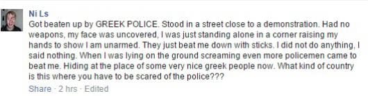 “Με έδειρε η ΕΛΛΗΝΙΚΗ ΑΣΤΥΝΟΜΙΑ. Στεκόμουν στο δρόμο, κοντά στη διαδήλωση. Δεν είχα όπλα, το πρόσωπό μου ήταν ακάλυπτο, απλά στεκόμουν μόνος σε μια γώνια, έχοντας σηκωμένα τα χέρια μου για να φαίνεται ότι είμαι άοπλος. Με έριξαν στο έδαφος βαρώντας με τα γκλομπ. Δεν είχα κάνει τίποτα, δεν είχα πει τίποτα. Ενώ ήμουν πεσμένος στο έδαφος, ουρλιάζοντας, ακόμα περισσότεροι αστυνομικοί ερχόντουσαν να με βαρέσουν. Αυτήν την στιγμή κρύβομαι στο σπίτι κάποιων πολύ ευγενικών Ελλήνων. Τι χώρα είναι αυτή που πρέπει να φοβάσαι την αστυνομία;;;”