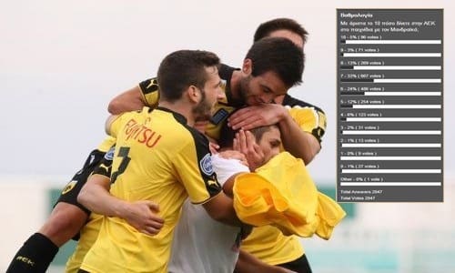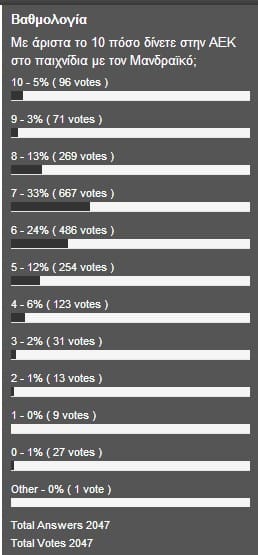Πολύ ενδιαφέρον παρουσιάζει η άποψη του κόσμου της ΑΕΚ για την εμφάνιση της ομάδας κόντρα στον Μανδραϊκό… Στην ερώτηση του AEK LIVE να βαθμολογήσουν την εμφάνιση της Ένωσης οι αναγνώστες δίνουν κατά πλειοψηφία βαθμό 7.