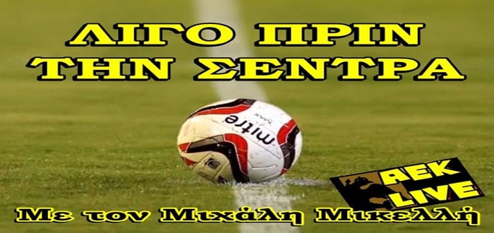 Παρασκευή σήμερα και όπως κάθε Παρασκευή θα έχει ”Λίγο πριν την σέντρα” ακριβώς στις 21:00 με τον Μιχάλη Μικελλή.Μαζί σας για δυο ώρες θα αναπτύξουμε, θα σχολιάσουμε, την αγωνιστική που πέρασε, αλλά και αυτήν που έρχεται σε όλα τα αθλήματα της ΑΕΚΑΡΑΣ ΜΑΣ.
