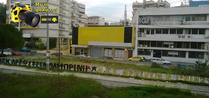 Στολίδι στο έμπα των Αγίων χωμάτων της Νέας Φιλαδέλφειας… Η φωλιά της ORIGINAL φόρεσε κιτρινόμαυρα χρώματα τόσο στην πρόσοψη όσο και στην πλαϊνή πλευρά απ’ όπου είναι και η είσοσος και δίνει πλέον μια άλλη ομορφιά στην περιοχή… Δείτε τις φωτογραφίες του AEK LIVE.
