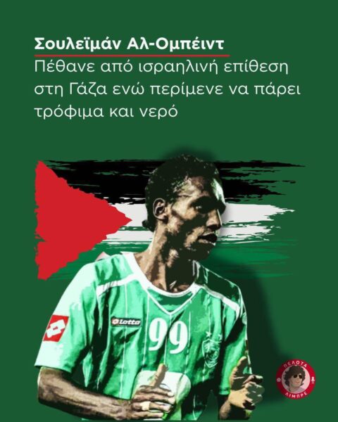 Ίσως πολλοί να μην τον ξέρουμε και να μην έχουμε ξανακούσει το όνομά του, αλλά για τους Παλαιστίνιους ήταν ενας θρύλος του ποδοσφαίρου. Το νήμα της ζωής του Αλ-Ομπέιντ κόπηκε χθες ενώ περίμενε για ανθρωπιστική βοήθεια στη Γάζα, προσπαθώντας να θρέψει την οικογένειά του. Σύμφωνα με δημοσιογραφικές πηγές, ισραηλινές δυνάμεις επιτέθηκαν σε ανθρώπους που περίμεναν απεγνωσμένα για τρόφιμα και νερό σε συγκεκριμένο σημείο συγκέντρωσης και ο Σουλεϊμάν ήταν ένας από αυτούς.