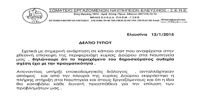 Αανακοίνωση εξέδωσαν οι εργαζόμενοι στα Ναυπηγεία Ελευσίνας σχετικά με την παρουσία της Ρένας Δούρου και τα όσα δημοσιεύτηκαν περί συσχετισμού ΑΕΚ και Χρυσής Αυγής… Στο πλαίσιο δεοντολογίας, δημοσιεύουμε το κείμενο των εργαζομένων και ελπίζουμε – πραγματικά ελπίζουμε – επειδή είμαστε βαθειά δημοκράτες, να μην ειπώθηκε όντως το παραμικρό, ούτε υπό μορφή κακόγουστου και άνοστου αστείου… Αστεία με τους Νεοναζί και την προσφυγική ΑΕΚ δεν υπάρχουν, ούτε σε επίπεδο βλακώδους ανέκδοτου… Ειλικρινά ευχόμαστε το επίμαχο δημοσιεύμα το οποίο αναπαράγαμε με ερωτηματικά, να μην ισχύει και να αποτελεί όντως ψευδές, σκόπιμο και παρακινούμενο δημοσίευμα (όπως αναρωτηθήκαμε στο δικό μας άρθρο…)
