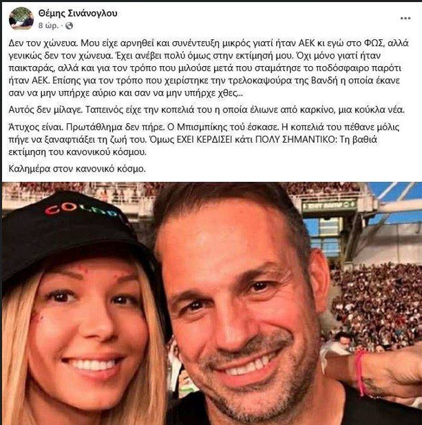 Γράφει ο σκοταδόψυχος, υποτίθεται για το πένθος του Νικολαΐδη και θυμάται το πρωτάθλημα που δεν μπόρεσε να πάρει με την ΑΕΚ, θυμάται τον νέο σύντροφο της πρώην συζύγου του, Δέσποινας Βανδή. Και θυμάται… το τι τράβηξε κοντά της ως σύζυγος.