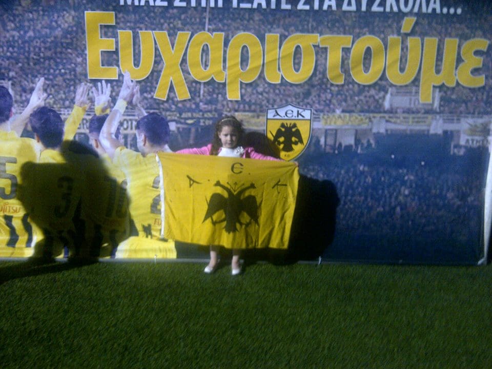 Η μικρή της φωτογραφίας, είναι η Κωνσταντινούπολη. Έτσι λέγεται, έτσι είναι το όνομα της… Έχει το όνομα της ομορφότερης, πολιορκημένης πόλης του κόσμου… Η Κωνσταντινούπολη, είναι κόρη του γνωστού Ενωσίτη της Βέροιας, Βένου Κωστελίδη και δεν έλειψε από την φιέστα της Παρασκευής στα Σπάτα… Στην πρώτη φωτογραφία κρατά την ιστορική σημαία του Αλέξανδρου Μαργαρίτη, η οποία έχει ταξιδέψει σε κάθε γωνιά της γης…