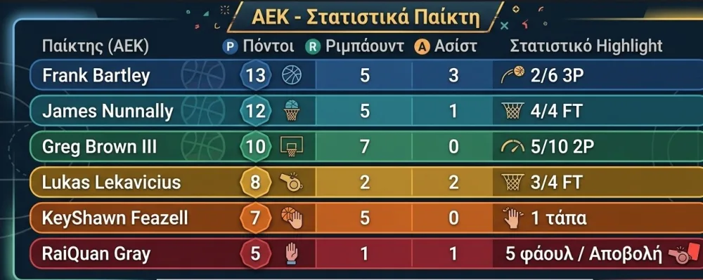 Ο πίνακας παρουσιάζει την ατομική απόδοση των βασικών διακριθέντων της ΑΕΚ στην εκτός έδρας αναμέτρηση κόντρα στην Μπανταλόνα, με τον Frank Bartley να ηγείται στο σκοράρισμα με 13 πόντους και 2 εύστοχα τρίποντα.