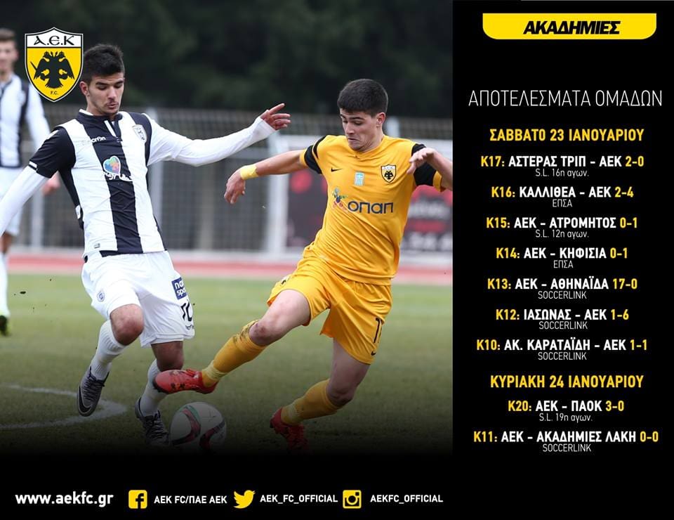 Τα αποτελέσματα των τμημάτων υποδομής της ΑΕΚ το Σαβββατοκύριακο 23-24 Ιανουαρίου.