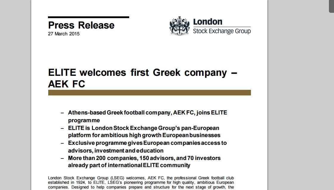 Tην ένταξη της στο πρόγραμμα ELITE του χρηματιστηρίου του Λονδίνου επιβεβαίωσε η ΠΑΕ ΑΕΚ,. Είναι η πρώτη ελληνική εταιρεία που θα ανήκει στο συγκεκριμένο πρόγραμμα, με το οποίο συνεργάζονται περισσότερες από 200 επιχειρήσεις σε όλη την Ευρώπη.