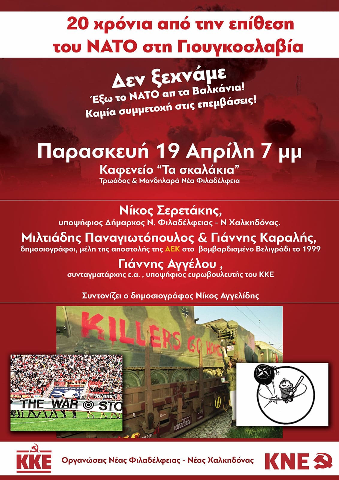 Εκδήλωση με θέμα τα 20 χρόνια από την ιμπεριαλιστική επέμβαση του ΝΑΤΟ στη Γιουγκοσλαβία, διοργανώνουν οι Οργανώσεις του ΚΚΕ και της ΚΝΕ σε Νέα Φιλαδέλφεια – Νέα Χαλκηδόνα, την Παρασκευή 19 Απρίλη στις 7 μ.μ. στο καφενείο «Τα σκαλάκια» (Τρωάδως και Μανδηλαρά).