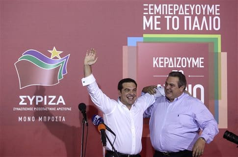 Τη νέα κυβερνητική συνεργασία με τον Πάνο Καμμένο και τους ΑΝΕΛ επιβεβαίωσε ο Αλέξης Τσίπρας μιλώντας μετά το εκλογικό αποτέλεσμα στο κεντρικό εκλογικό περίπτερο του ΣΥΡΙΖΑ στην πλατεία Κλαυθμώνος, όπου έγινε δεκτός με ενθουσιασμό από πλήθος κόσμου. Στο βήμα μαζί του ανέβηκε και ο Πάνος Καμμένος, που έγινε κι αυτός δεκτός με χειροκροτήματα από τους οπαδούς του ΣΥΡΙΖΑ.