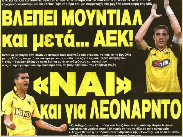 Κατσουράνης μετά το μουντιάλ και Λεονάρντο το καλοκαίρι είναι οι επόμενες κινήσεις της ΑΕΚ, σύμφωνα με το πρωτοσέλιδο της “Ωρας των Σπορ”.