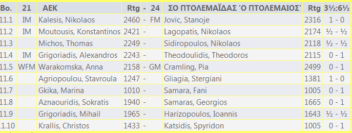 Από την ΑΕΚ νίκησαν ο Καλέσης και η Αγριοπούλου, ισοπαλία έφεραν οι Μουτούσης, Μίχος και Γρηγοριάδης Μιχαήλ, ενώ ηττήθηκαν οι Γρηγοριάδης Αλέξανδρος, Warakomska, Γκίκας, Αζναουρίδης και Κράλλης.