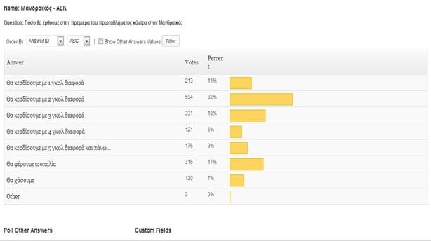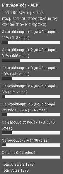 Από τους 1876 οπαδούς της ΑΕΚ που πήραν μέρος, το 31% ( 586 ψήφοι) απάντησε ότι θα κερδίσουμε με 2 γκολ διαφορά, όπως και έγινε. Η ομάδα του Δικέφαλου αετού επικράτησε 2-0…