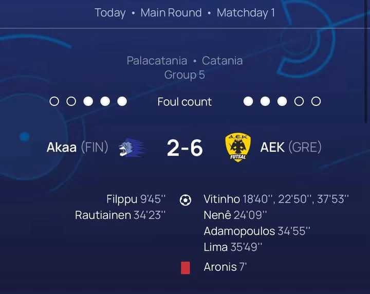 ΕΡΑΣΙΤΕΧΝΙΚΗΘρίαμβος στην Ιταλία Published 6 μήνες agoon 29 Οκτωβρίου 2025By ΑΕΚ LIVE Views 1Για την πρώτη αγωνιστική του Champions League Ποδοσφαίρου Σάλας η ΑΕΚ θριάμβευσε στην Κατάνια της Ιταλίας, επί της Φινλανδικής ΑΚΑΑ με 6-2. Τα κιτρινόμαυρα γκολ πέτυχαν Βιτίνιο (3), Νενέ, Φαμπρίτσιο και Αδαμόπουλος. Related Topics: Up NextΆννα Βάπτισμα: Ρώτησα τα μάτια μου Don't Miss10 γκολ στην Ηλιούπολη! ΑΕΚ LIVE Continue Reading Advertisement You may like