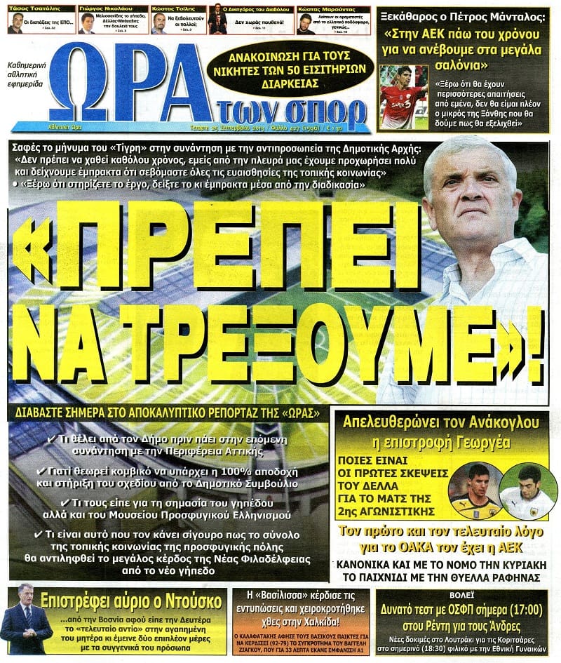 Η εφημερίδα γράφει για τη συνάντηση του Δήμου με τον Μελισσανίδη, ο οποίος ζήτησε να μην χαθεί καθόλου χρόνος. Παράλληλα γίνεται αναφορά στα σχέδια του για την κατασκευή του γηπέδου.
