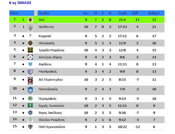 Η Ένωση έχει 23 βαθμούς, 2 περισσότερους από τον 2ο Ηρόδοτο. Τρίτη είναι η Κηφισιά με 17 βαθμούς.