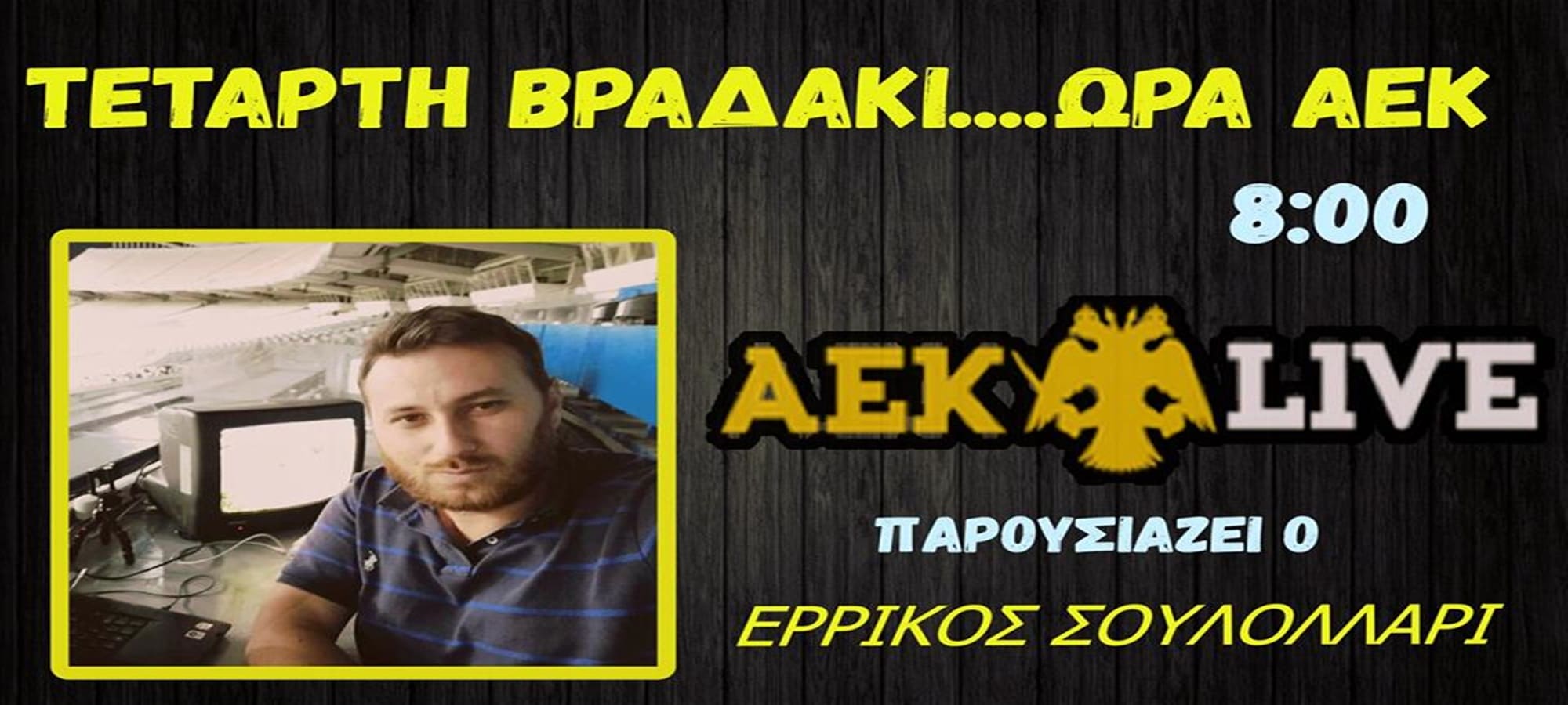 Μην χάσετε αυτήν την Τετάρτη την εκπομπή ΄΄Τετάρτη βραδάκι..ώρα ΑΕΚ΄΄ στις 8 με καλεσμένο τον Vagelis Arnaoutoglou. Θα έχω την τιμή να τα πούμε on-air για την αγαπημένη μας ΑΕΚ και βέβαια να απαντήσει στα δικά σας μηνύματα.