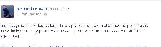Όπως φαίνεται, ούτε ο Νάβας έχει ξεχάσει τους Ενωσίτες, τους οποίους ευχαρίστησε για τις ευχές του. «Πολλά ευχαριστώ σε όλους τους οπαδούς της ΑΕΚ για τα μηνύματα χαιρετισμού. Αυτή η μέρα είναι αξέχαστη για μένα, θα είστε πάντα στην καρδιά μου. ΑΕΚ για πάντα!!!», έγραψε ως στάτους στο facebook.
