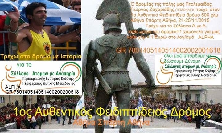 «Τρέχοντας στο δρόμο με Ιστορία για το Σύλλογο Ατόμων με Αναπηρία. Όλοι Μαζί μπορούμε να στηρίξουμε την προσπάθεια… Πάμε να “γράψουμε” ΑμεΑ = Ατομα με Αγάπη … — ἐν Στα χνάρια του Φειδιππίδη και της Ιστορίας….», έγραψε στο status του.