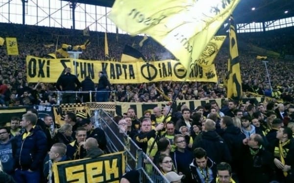 Οι διαμαρτυρίες των οργανωμένων κατά της “κάρτας φιλάθλου” βρήκαν συμπαράσταση από τους οπαδούς της Ντόρτμουντ, οι οποίοι σήκωσαν πανό κατά της κάρτας φιλάθλου στην αναμέτρηση με την Μάιντς, το οποίο ήταν γραμμένο στα ελληνικά!