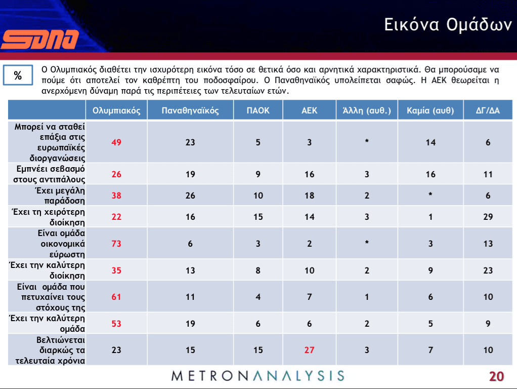 ✓ Το σλόγκαν «ερχόμαστε» που έχει υιοθετήσει η ΑΕΚ φαίνεται ότι βρίσκει λαϊκή απήχηση, αφού παρά τις πρόσφατες περιπέτειες των τελευταίων ετών, το 27% των ερωτηθέντων θεωρεί ότι είναι η ομάδα που βελτιώνεται διαρκώς τα τελευταία χρόνια κι ότι αποτελεί την ανερχόμενη δύναμη. Παραδόξως, παρά τα συνεχή πρωταθλήματα μόλις το 23% θεωρεί ότι ο Ολυμπιακός βελτιώνεται διαρκώς τα τελευταία χρόνια.
