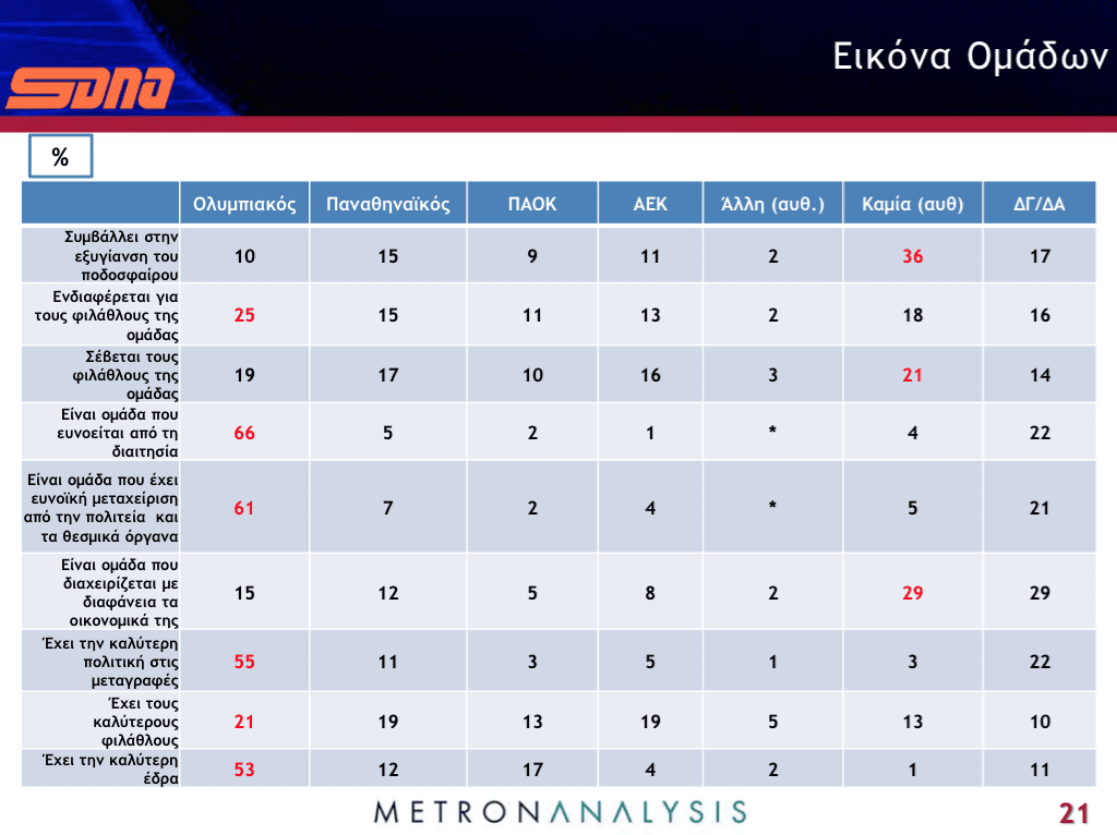 ✓ Mε τα κόκκινα στοιχεία σημειώνεται στους πίνακες η ομάδα που πήρε τις περισσότερες απαντήσεις. Όπως είναι εύκολο να διαπιστώσει κανείς, στις περισσότερες κυριαρχεί ο Ολυμπιακός, είτε για θετικούς είτε για αρνητικούς λόγους.