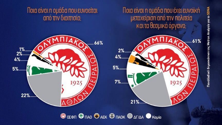 Η ελληνική κοινή γνώμη για πρώτη φορά κατονομάζει ανοιχτά τον Ολυμπιακό -με ποσοστό που προκαλεί πάταγο- ως την ομάδα που απολαμβάνει την ευνοϊκότερη μεταχείριση από διαιτησία και θεσμικά όργανα και δίνει απαντήσεις φωτιά σε 18 καίρια ερωτήματα του ελληνικού ποδοσφαίρου, που αφορούν ονομαστικά τους συλλόγους.