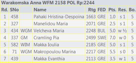 Η κοινοτική σκακίστρια της ΑΕΚ, η πολωνή Anna Warakomska, αποτέλεσε την ευχάριστη έκπληξη από πολλές πλευρές. Καταρχάς τα έξοδα μετακίνησής της καλύφθηκαν από το club της Original Σάμου, μόνο και μόνο για να μπορέσει η ΑΕΚ να έχει ισχυρή παρουσία στην γυναικεία σκακιέρα, αφού η Διοίκηση του συλλόγου παρέμενε απούσα και άφαντη. Τα παιδιά από το εν λόγω επαρχιακό club, με δική τους πρωτοβουλία και με χρήματα προερχόμενα από το (μικρό) ταμείο τους, σε δύσκολους καιρούς, βοήθησαν την ομάδα επανδρώνοντας μια νευραλγική σκακιέρα με μια ισχυρή σκακίστρια. Και η Anna τους δικαίωσε… Πέτυχε σε 7 αγώνες στην 5η σκακιέρα, 4 νίκες, 1 ισοπαλία και 2 ήττες, αντιμετωπίζοντας 1 GM, 2 WGM και 1 WIM. Είχε απόδοση 86 βαθμούς περισσότερους από το διεθνές της ELO και σίγουρα θα βοηθήσει μελλοντικά την ΑΕΚ και σε άλλες διοργανώσεις, αφού από την πρώτη στιγμή έγινε μέλος της ομάδας, μαθαίνοντας και ρωτώντας για την Ιστορία του συλλόγου σε όλα τα αθλήματα.