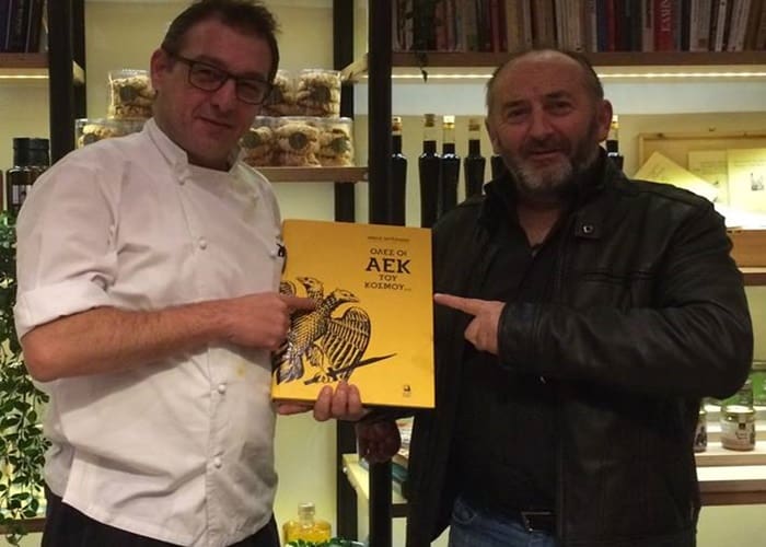 Στη φωτογραφία O κορυφαίος – πολυβραβευμένος σεφ, υποδέχεται στο διάσημο εστιατόριο του, τον καλό φίλο Κωνσταντίνο – Τάκη Νέτη, αγκαλιά με τις ΑΕΚ όλου του κόσμου