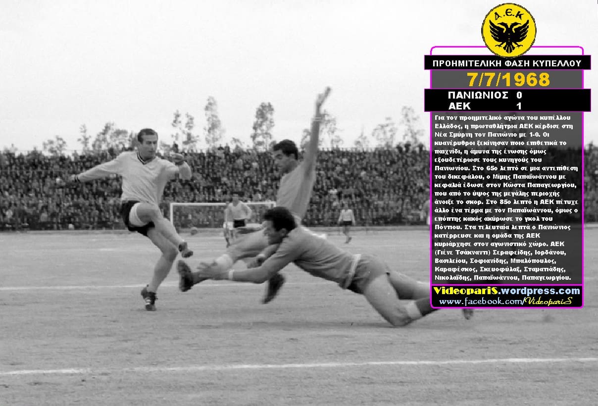 7-7-1968. Για τον προημιτελικό αγώνα του κυπέλλου Ελλάδος, η πρωταθλήτρια ΑΕΚ κέρδισε στη Νέα Σμύρνη τον Πανιώνιο με 1-0.