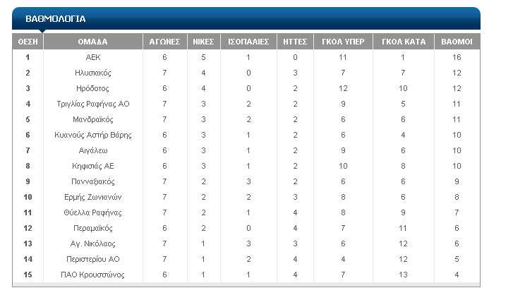 | 7 | Αιγάλεω | 6 | 3 | 1 | 2 | 9 | 6 | 10 |