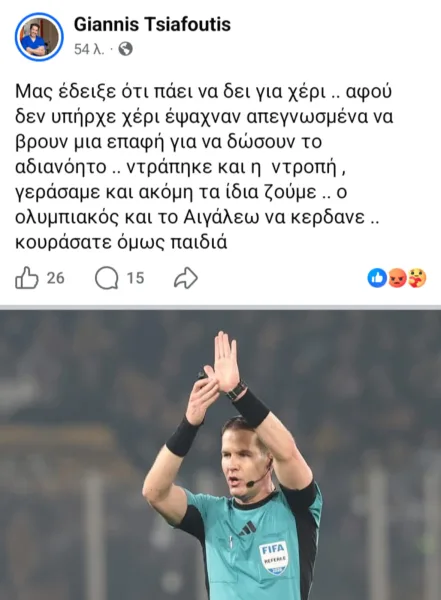 * Ο «Στέφανος» έβαλε τον εαυτό του «παρατηρητή» στο πρόσφατο Αστέρας Τρίπολης- ΑΕΚ 0-1, που ο Ευαγγέλου {με VARτον Τσακαλίδη} έκανε χρήση της «σημαδεμένης «καρτοτράπουλας» κι έθεσε νοκ ντάουν {ενόψει Οσφπ, Σερρών, Παόκ} 4 αετόπουλα, θαρρείς και ήταν…κοτόπουλα, τους Γιόβιτς, Ρότα, Ρέλβας, Κοϊτά. Σε ανταπόδοση των υπηρεσιών, που προσφέρθηκαν εναντίον της ΑΕΚ, αμφότεροι ορίστηκαν για την μεθαυριανή {Τετάρτη} ημιτελική φάση του κυπέλλου, ο Αθηναίος ΄Αγγελος στο…Πάο-Παόκ {με 4ο τον …Βεργέτη – σχεδόν μόνιμο στον Μπενιτεθιακό- και στο VARΚροάτες} και τον Χαλκιδικιώτη Αλέξανδρο στο Οφη- Λεβαδειακός, «πάνοπλο» με τους «καθεστωτικούς» Κουμπαράκη- Παπαπέτρου και 4ο τον Σιδηρόπουλο. «Περισσσεύοντας», από τους «διεθνείς» {η κακιά ώρα τους έχει δώσει το σήμα} ο Παπαδόπουλος βολεύτηκε VARίστας με συντροφιά το κοπέλι από το Λασίθι, μεγάλη συμπάθεια του Γάλλου, Μόσχο}, α’ διαιτητή τον «τεταγμένο» αντιΑΕΚτσή Ηπειρώτη Κατσικογιάννη και 4ο τον ομοϊδεάτη του από την Εύβοια, Ματσούκα, για το επίσης μεθαυριανό Αστέρας Τρίπολης- Οσφπ, το εξ αναβολής για την 17η αγωνιστική