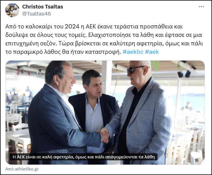 🦅 Στην παρούσα φάση που βρίσκεται η ΑΕΚ, μιλάμε για βασικές επιλογές, μιλάμε για αλλαγές στον κορμό. Η απουσία του προπονητή από τη διαδικασία δημιουργεί εύλογες ανησυχίες. Ο προπονητής οφείλει να έχει τον τελευταίο λόγο στις προσθήκες.