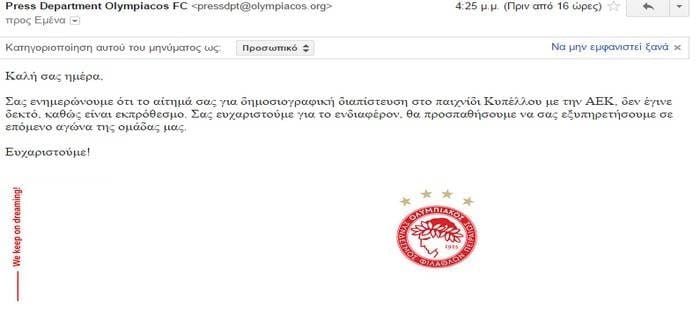 Το πρωί της Δευτέρας, δηλαδή περισσότερο από δυο ημέρες και… πριν από τον αγώνα Ολυμπιακού – ΑΕΚ, στείλαμε αίτημα προς την ΠΑΕ Ολυμπιακός, για την διευκόλυνση των διαπιστευμένων δημοσιογράφων του AEK LIVE που είχε προγραμματιστεί να πάνε στο Καραϊσκάκη για να μεταδώσουν ζωντανά τον αγώνα του κυπέλλου και να μεταφέρουν ΟΛΟ το ρεπορτάζ με φωτογραφίες και ρεπορτάζ.