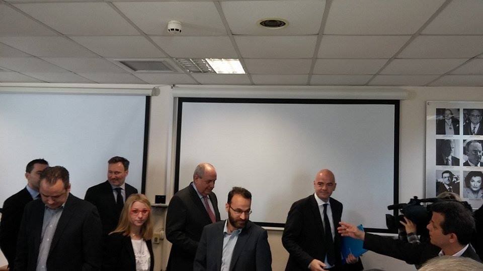 Ο Ινφαντίνο έφτασε λίγο πριν τις 11 μαζί με τους Κομνηνό και Γκιρτζίκη, ενώ στην συνάντηση θα δώσουν το παρών ο νομικός σύμβουλος της ΕΠΟ κ. Σαράκης, ο Γενικός Γραμματέας Αθλητισμού, κ. Συναδινός και εκπρόσωποι κομμάτων, όπως οι Δριτσέλη (ΣΥΡΙΖΑ) Χαϊκάλης, Κουίκ (ΑΝΕΛ), Μαυρωτάς (Ποτάμι), Κουκοδήμος (ΝΔ), Χριστοφιλοπούλου (ΠΑΣΟΚ), Γκιόκας (ΚΚΕ).