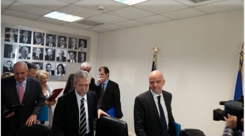 Η ώρα της… κρίσης για το Ελληνικό ποδόσφαιρο έφτασε, καθώς ξεκίνησε η συνάντηση του Τζιάνι Ινφαντίνο, Νο.2 στην ιεραρχία της UEFA, με τον Υφυπουργό Αθλητισμού, Σταύρο Κοντονή, για το επίμαχο νομοσχέδιο και την αποφυγή του καταστροφικού για την χώρα μας «Grexit» από τον χάρτη του Παγκόσμιου ποδοσφαίρου.