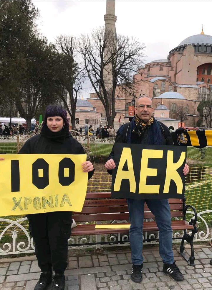 Ο Γιώργος Μαμαγκάκης, ιστορικό στέλεχος του Συνδέσμου Οπαδών ΑΕΚ Νέας Υόρκης που ιδρύθηκε το 1988, έφτασε μέχρι την Πόλη και την Αγιά Σοφία για να τιμήσει την ΑΕΚΑΡΑ. Μαζί με την κόρη του Μαρία με χαρτόνια κιτρινόμαυρα χαιρετίζουν στην πιο όμορφη πόλη του κόσμου, την πιο όμορφη ιδέα του κόσμου που γίνεται φέτος ενός αιώνα!