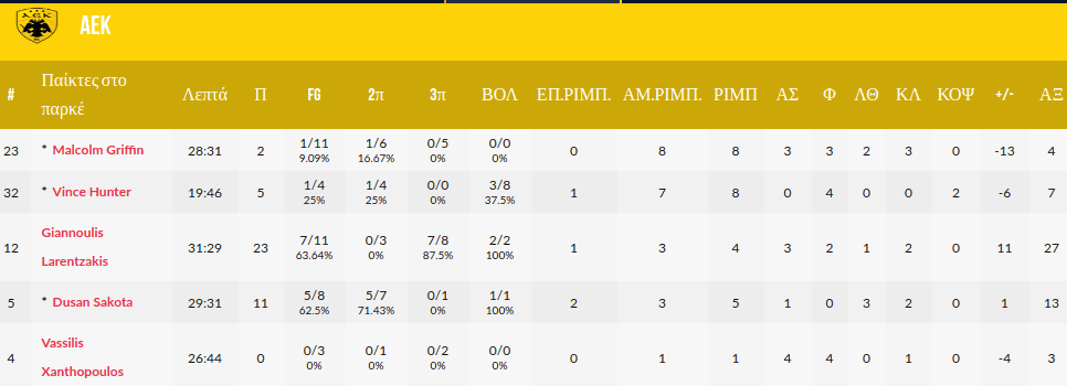 Η σημερινή ΑΕΚ στον αγώνα με την Νίμπουρκ τρέλανε την στατιστική! Δείτε τα πλήρη στατιστικά και παρατηρήστε τα νούμερα του Γιαννούλη Λαρεντζάκη (7/8 τρίποντα). Αν στον αμυντικό τομέα ήταν καλυτερη η Βασίλισσα τότε τον παρακάτω πίνακα θα τον κοιτάγαμε για πολύ καιρό…