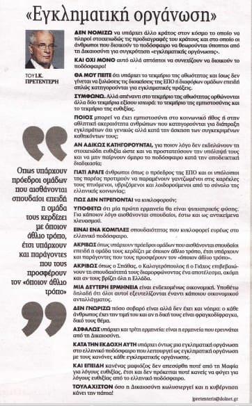 Τον Πρετεντέρη (και τον κάθε Πρετεντέρη…) που παίζει το παιχνίδι της εξουσίας και της εκάστοτε κυβέρνησης, δεν τον έχουμε σε υπόληψη… Όμως δεν πρέπει να θεωρείται αμελητέο, σημερινό του άρθρο στην εφημερίδα “Τα Νέα” όπου φωτογραφίζει τον Ολυμπιακό ως εγκληματική οργάνωση. Θα πρέπει να προβληματίσει πολλούς, το πως και το γιατί ο συστημικός δημοσιογράφος δεν έκλεισε το στόμα του στην συγκεκριμένη περίπτωση. Ιδού ολόκληρο το άρθρο…