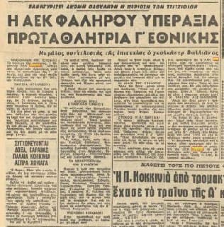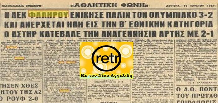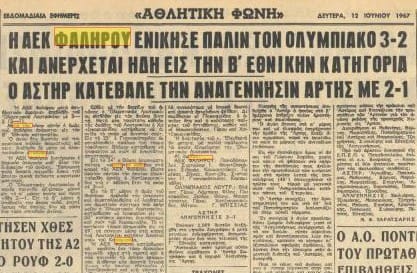 Η ΑΕΚ Φαλήρου ή ΑΕΚΤ (ΑΕΚ Τζιτζιφιών όπως την έλεγαν οι φίλοι της…) κρατήθηκε στη ζωή μέχρι το 1970. Η χούντα τελείωσε την μεγάλη εκείνη ομάδα η οποία είχε καταφέρει την άνοδο της στη Β’ Εθνική την περίοδο 1966-1667. Τότε είχε κατακτήσει την πρωτιά στον 2ο όμιλο του πρωταθλήματος της Γ’ Εθνικής πετυχαίνοντας την ιστορική άνοδο μετά από διπλό αγώνα μπαράζ με τον Ολυμπιακό Λουτρακίου, Η ΑΕΚ νίκησε τον Ολυμπιακό και τις δυο φορές με 3-2! Χαρακτηριστικό το δημοσιεύμα της εφημερίδας “Αθλητική Ηχώ”.