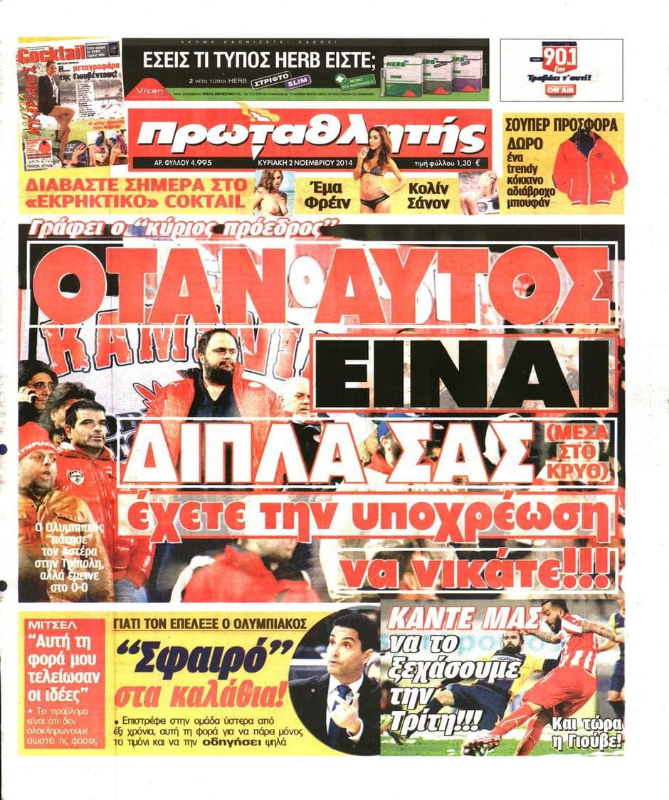 ΔΙΑΦΟΡΑΌχι, δεν είστε πρόβατα! Published 11 έτη agoon 2 Νοεμβρίου 2014By Βασίλης Γούσιος Views 257Στο ότι η ομάδα τους δεν βλεπόταν για ακόμη μία φορά στάθηκαν οι ερυθρόλευκοι «δημοσιογράφοι» παραβλέποντας φυσικά τη διαιτητική σφαγή. Γελάνε και τα τσιμέντα…Πάρτε ένα δείγμα (ασχολίαστο το πρωτοσέλιδο του «Πρωταθλητή») : Related Topics: Up NextΈβαλε φωτιά στο Facebook η Βαβάτση! (pic) Don't MissΓελάνε και οι ρέγγες με τον Ολυμπιακό Βασίλης Γούσιος Continue Reading Advertisement You may like