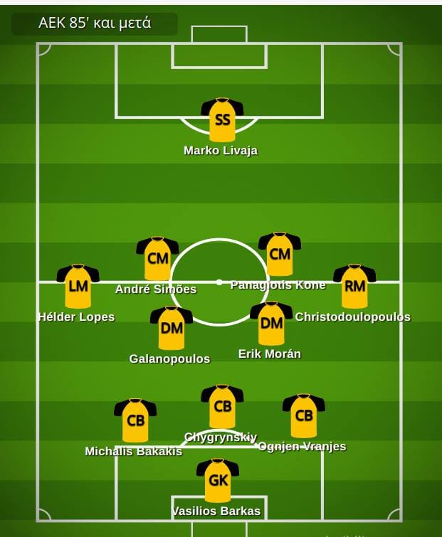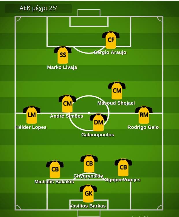 Η ΑΕΚ νομίζω οτι πρεπει να ξεκινησει με 3 πισω Μπακάκη-Τσιγκρίνσκι-Βράνιες και θα εχεις μια μείξη απο ταχύτητα-ποιότητα-δυναμισμό.Αριστερό χαφ ο Λόπες και αντιστοιχα στα δεξιά ο Γκάλο (που εχει και τις αλλοπρόσαλες στιγμές του) και θα κουμπώνουν στην άμυνα σε ενα συστημα στην ουσία με 5 αμυντικούς με αλληλοκαλύψεις και βοηθειες και μεσοεπιθετικά.Γαλανόπουλος θα πρέπει να ξεκινήσει σαν καθαρό αμυντικό χαφ και στο κέντρο θα βρίσκονται οι Σιμόες και ο Μασουντ ελαφρώς καποια βηματάκια πιο μπροστά.Επιθετικοί οι Αραούχο και ο Λιβάγια αυτην την φορά στο αριστερό άκρο της επίθεσης και σχετικά πιο τραβηγμένος προς τα έξω για να υποδεχεται την μπάλα,να την σπάει αλλα και να προσπαθεί να μπουκάρει καλύτερα.